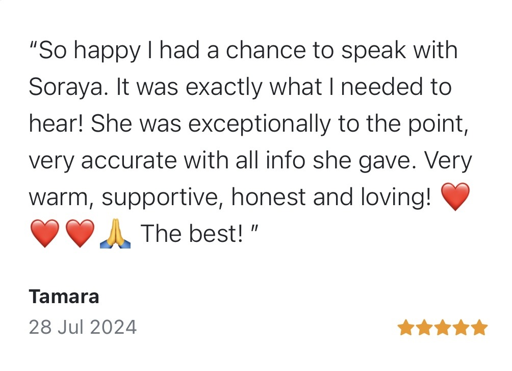Of u nu een luisterend oor wilt, iemand om mee te praten, of u nu antwoorden zoekt of advies wilt over liefde, carrière, relaties of een ander aspect van uw leven, Soraya is er om u de begeleiding en verlichting te bieden die u zo naarstig zoekt.