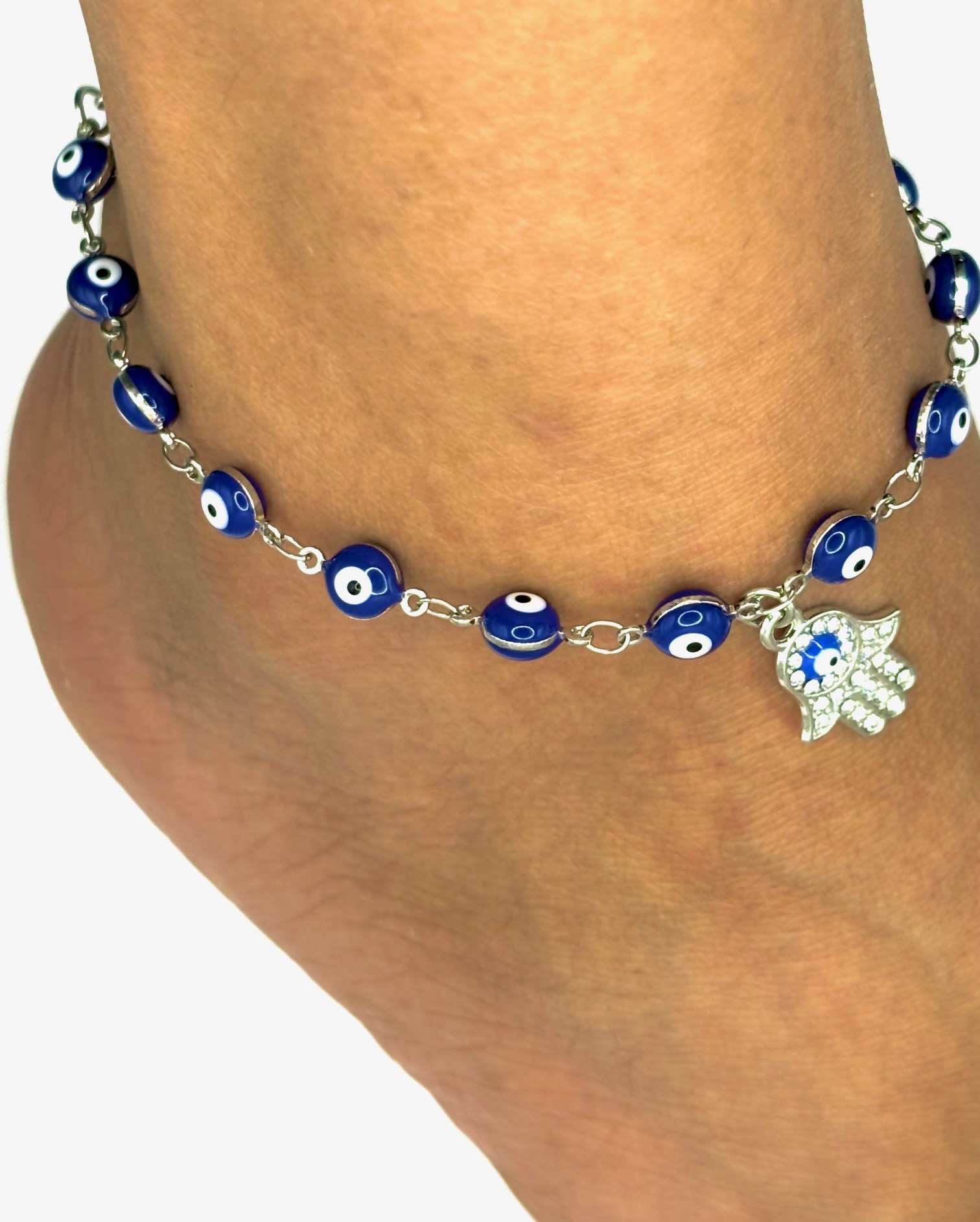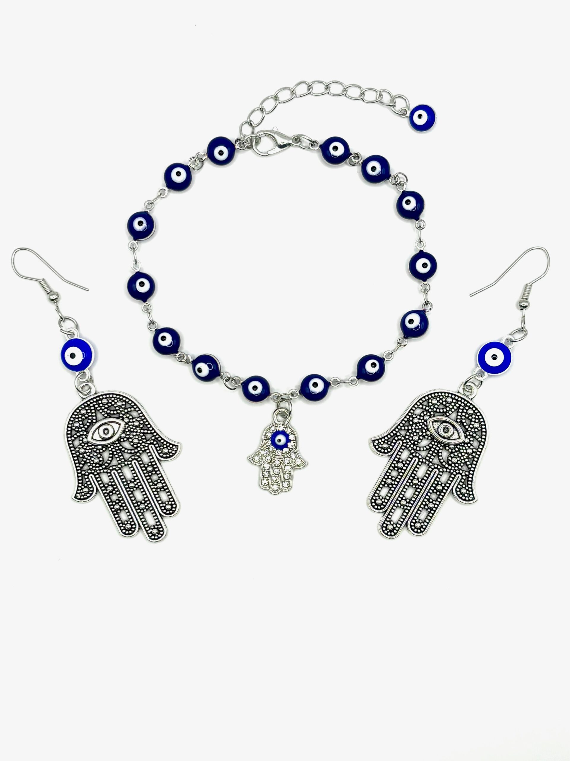 Deze bijzondere set bestaat uit een verfijnde enkelband met diepblauwe boze oog kraaltjes en een paar bijpassende oorbellen met het hamsa-symbool en het boze oog. Samen vormen ze een beschermings-duo die wereldwijd wordt gedragen als symbool van bescherming, geluk en spiritueel evenwicht.